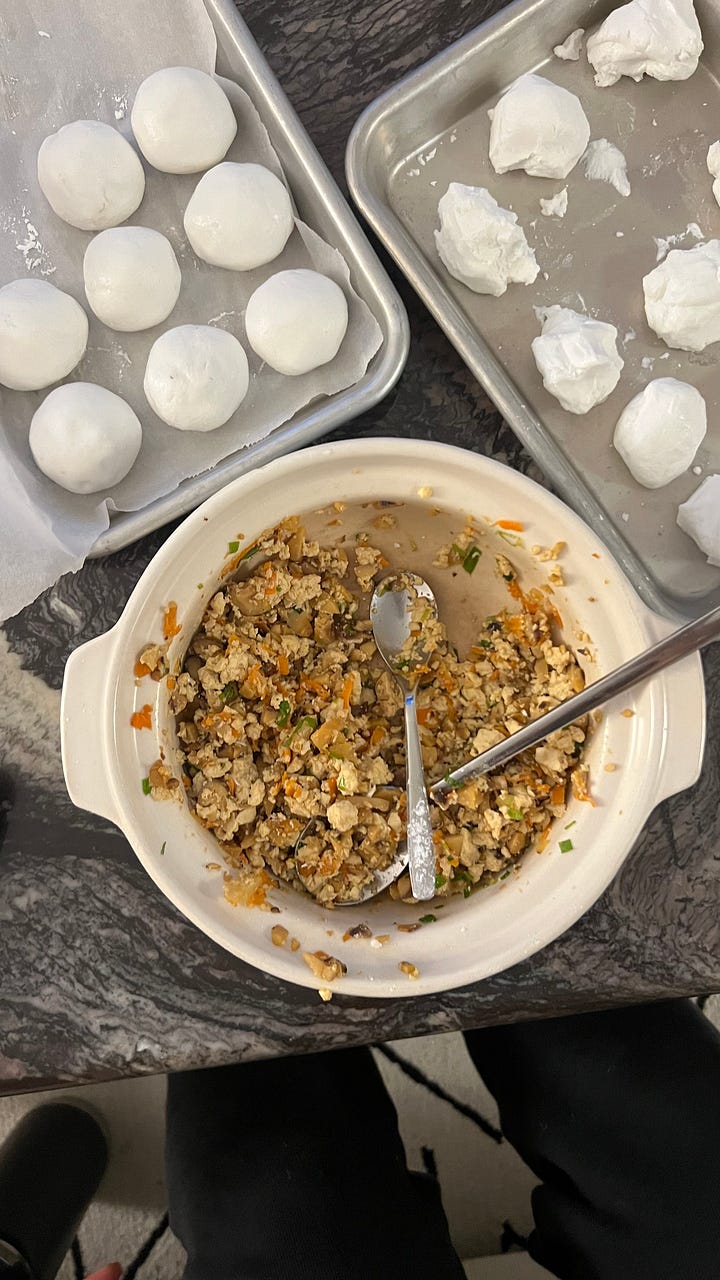 because i’ll be traveling the next two weeks i’m getting a head start on recipe testing for may’s supper club! i feel like savory tangyuan (mochi dumplings) is one of the most unique things i serve at my dinners and i really want to develop a vegetarian version of it! this first batch had firm tofu, dried shiitakes, carrot, and scallion. i was expecting these to be kinda annoying to fold but they ended up being sightlier easier than the meat ones! tbh they’re pretty good for a v1 but i think there’s more room to experiment with the filling combination.